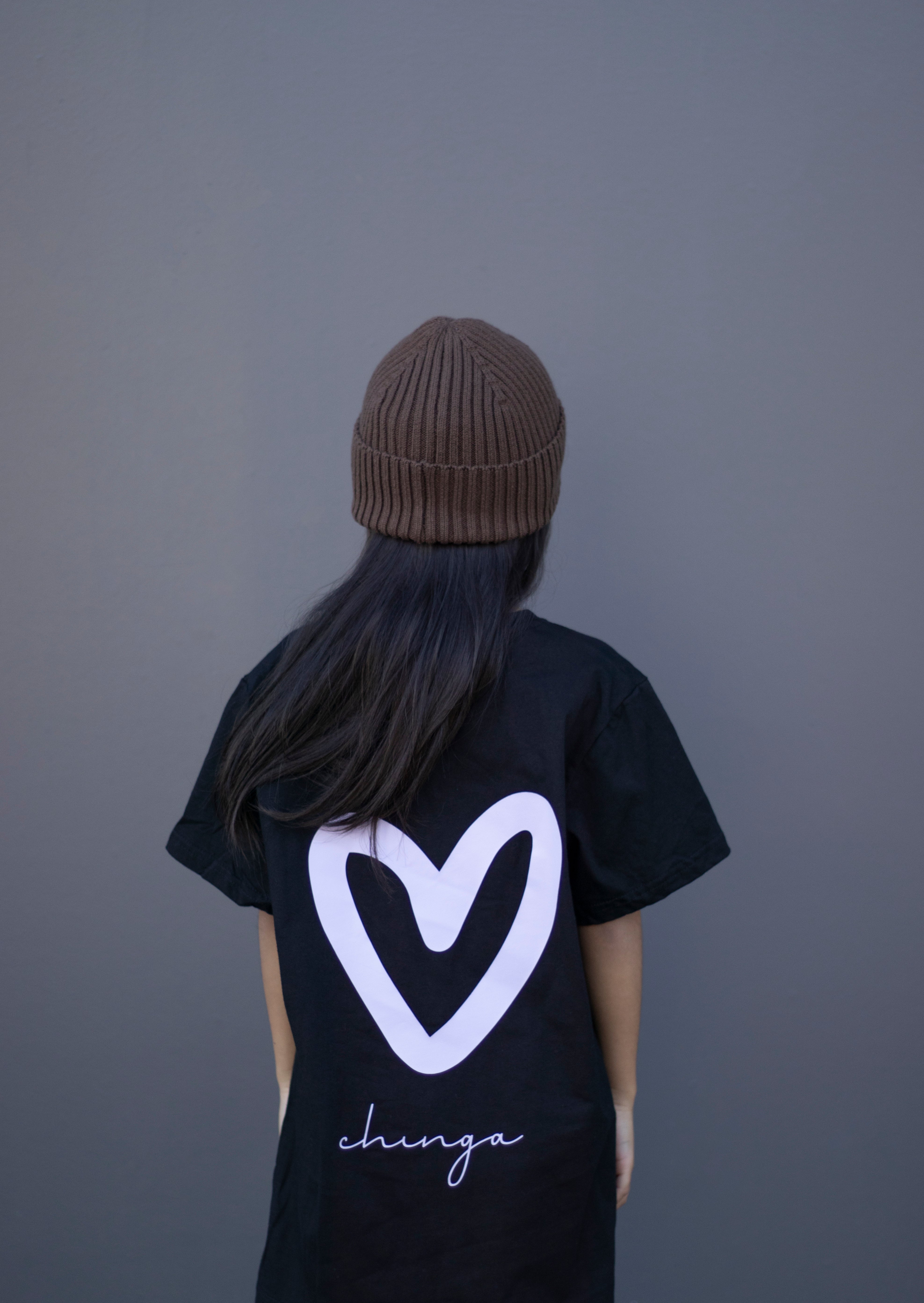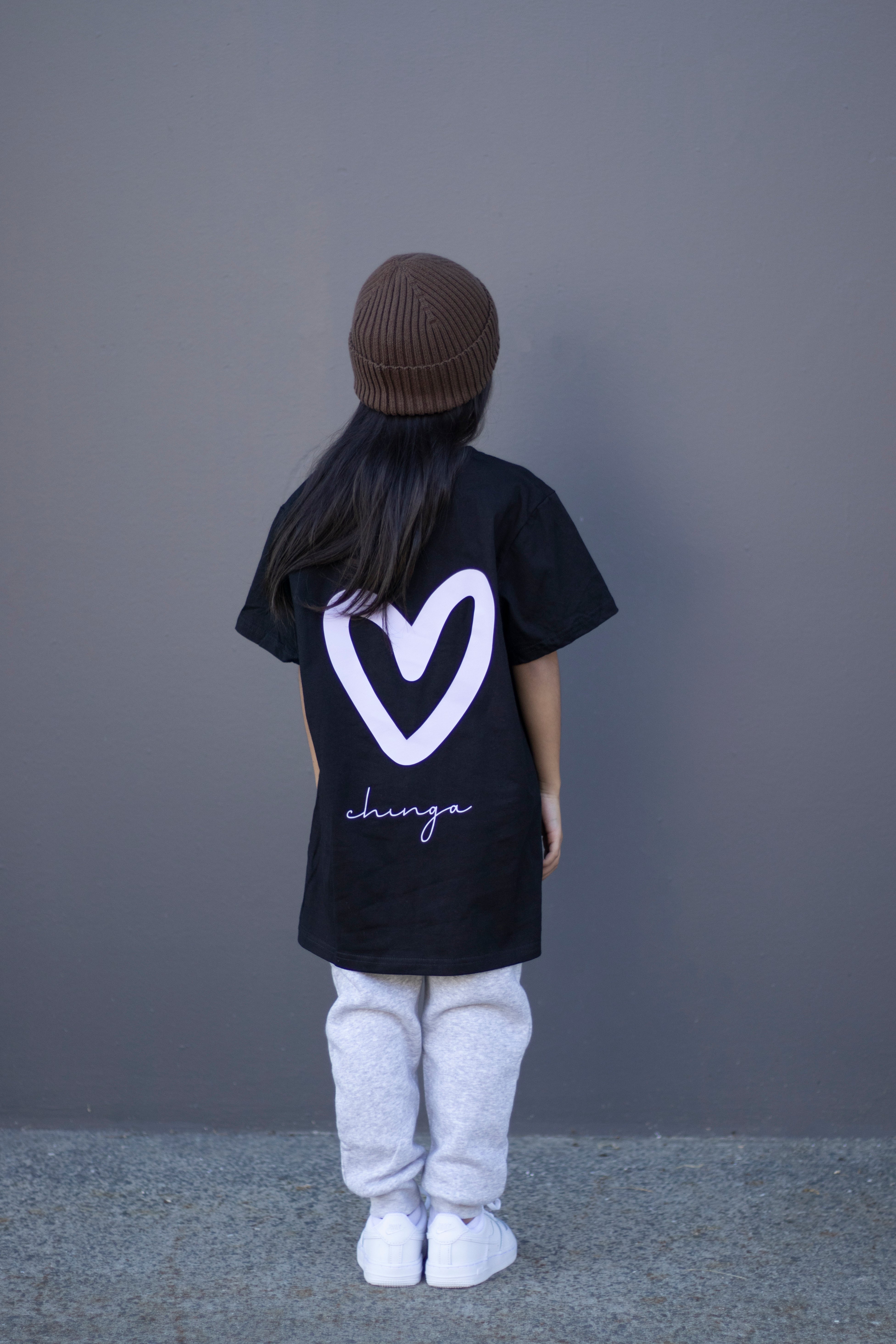 This delightful kids' tee features a soft, rounded neckline and short sleeves for comfort and ease. The back showcases a charming heart detailing and a playful print, adding a fun twist. Perfect for playdates or casual outings, this tee combines style and comfort effortlessly.