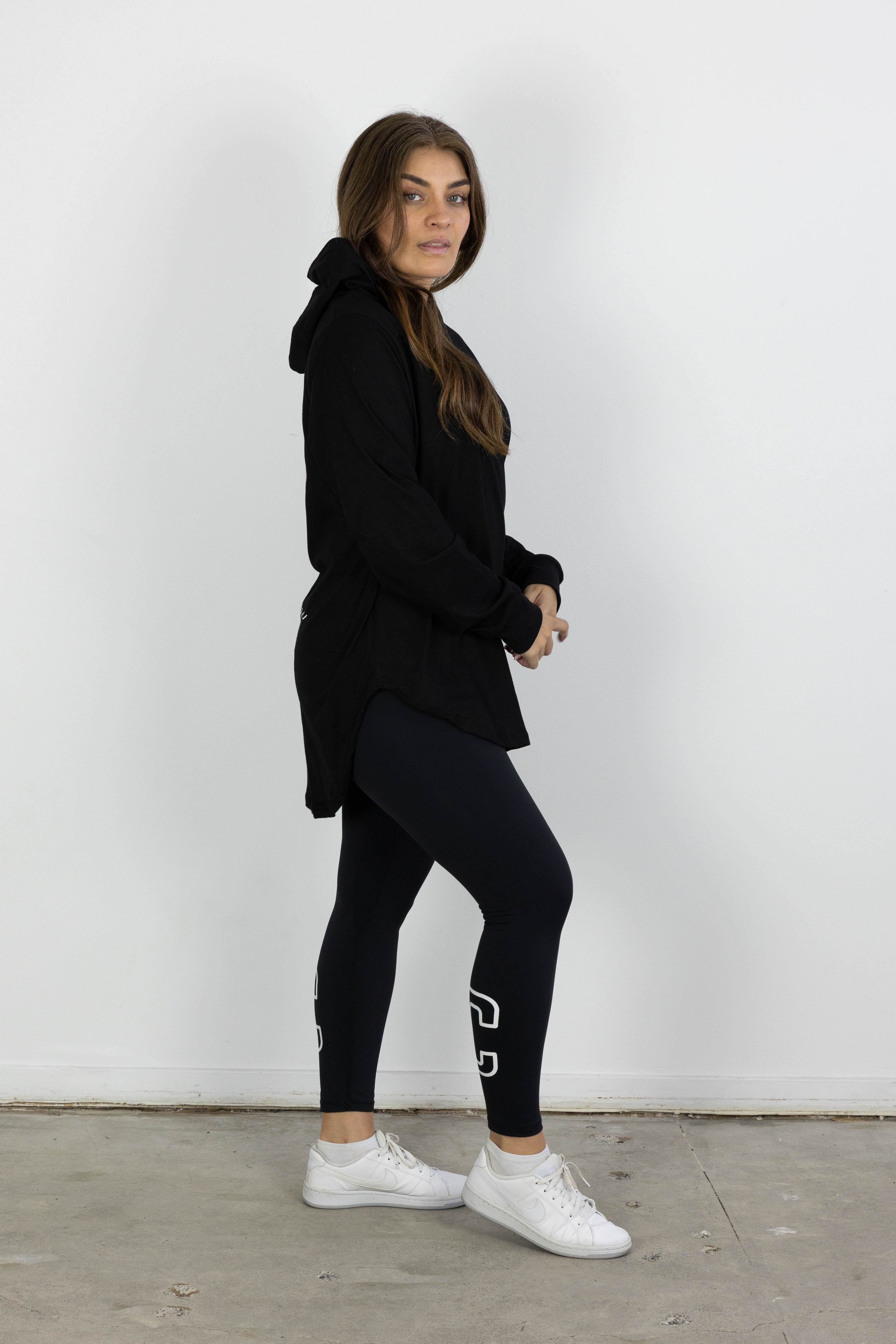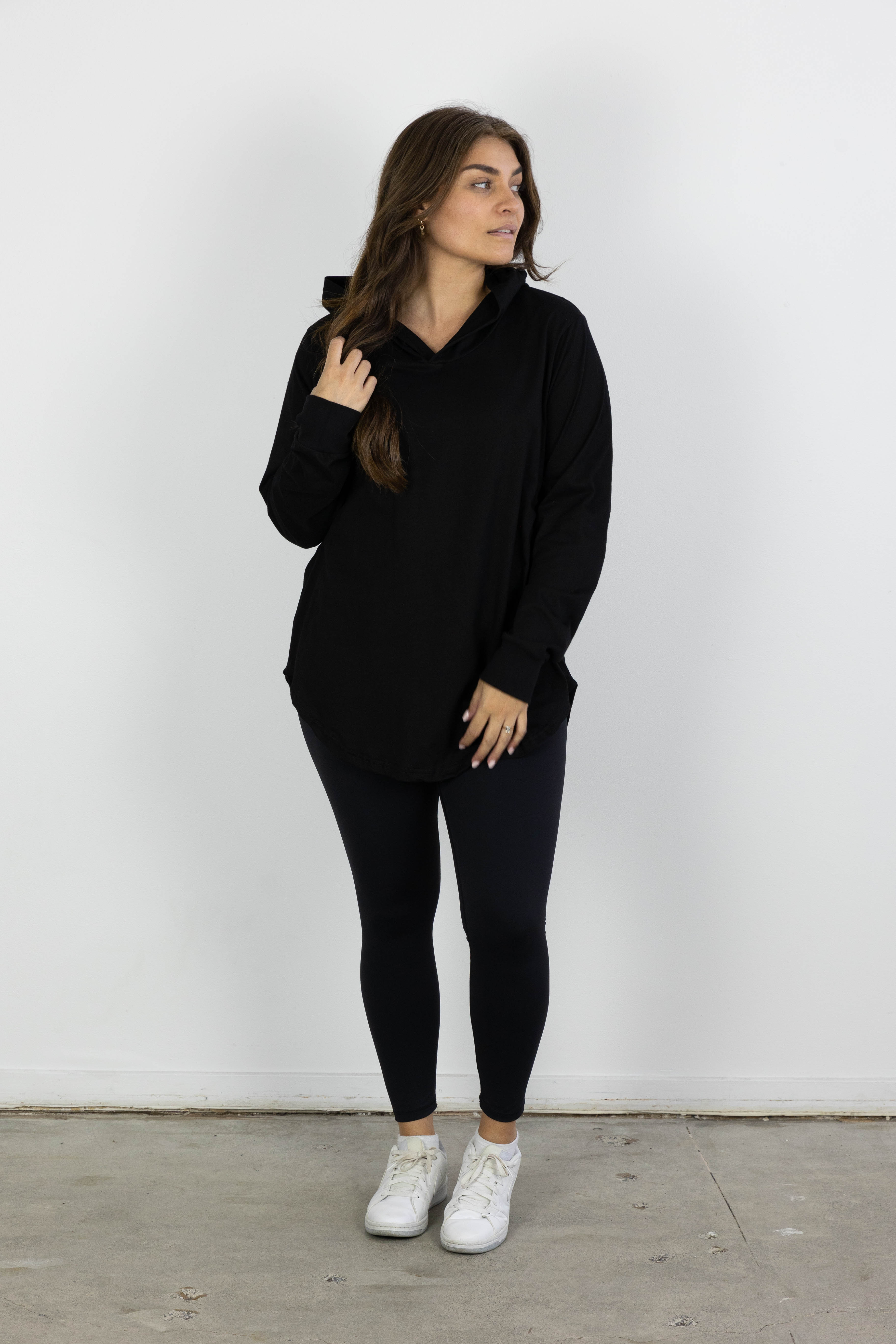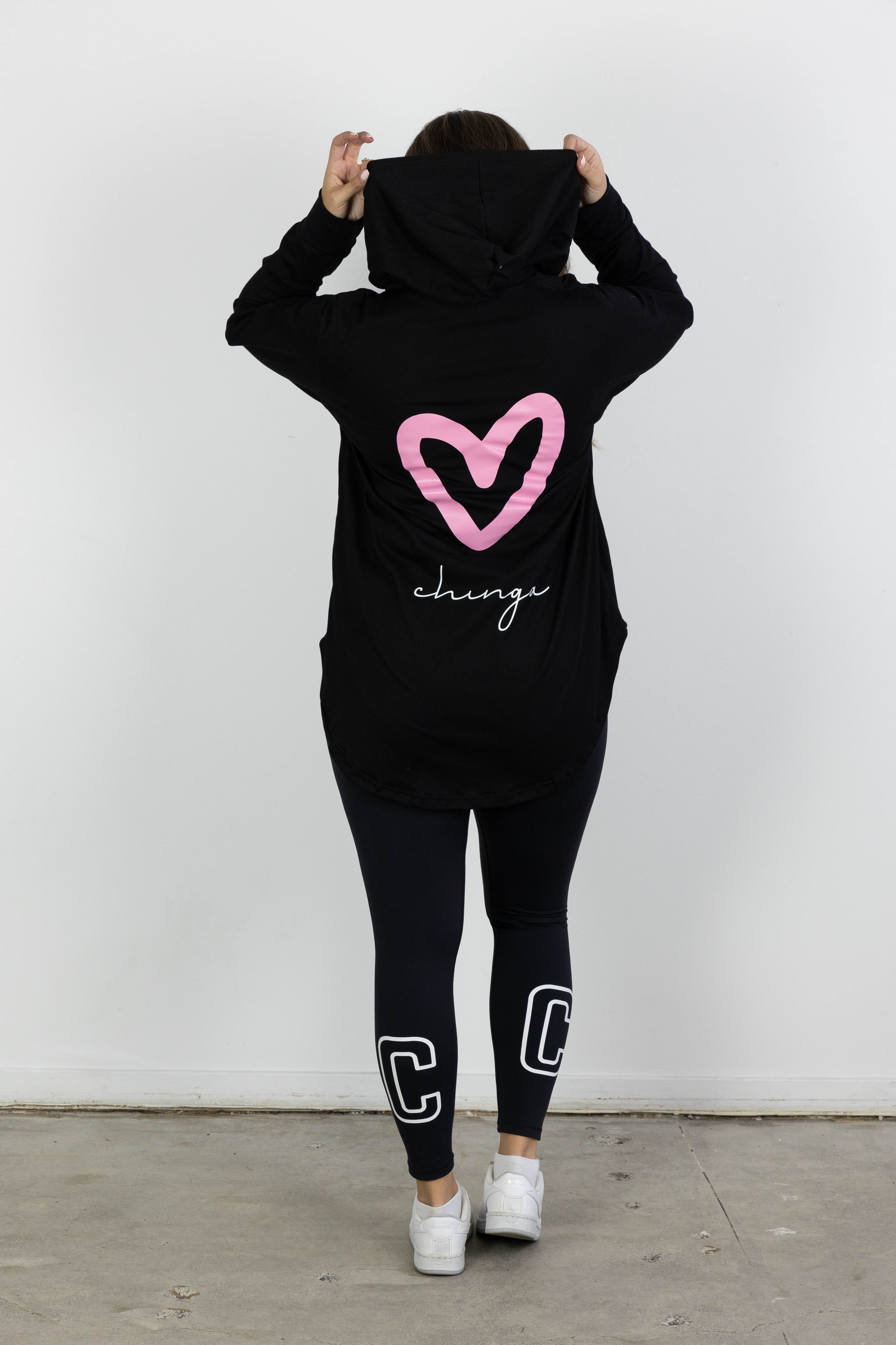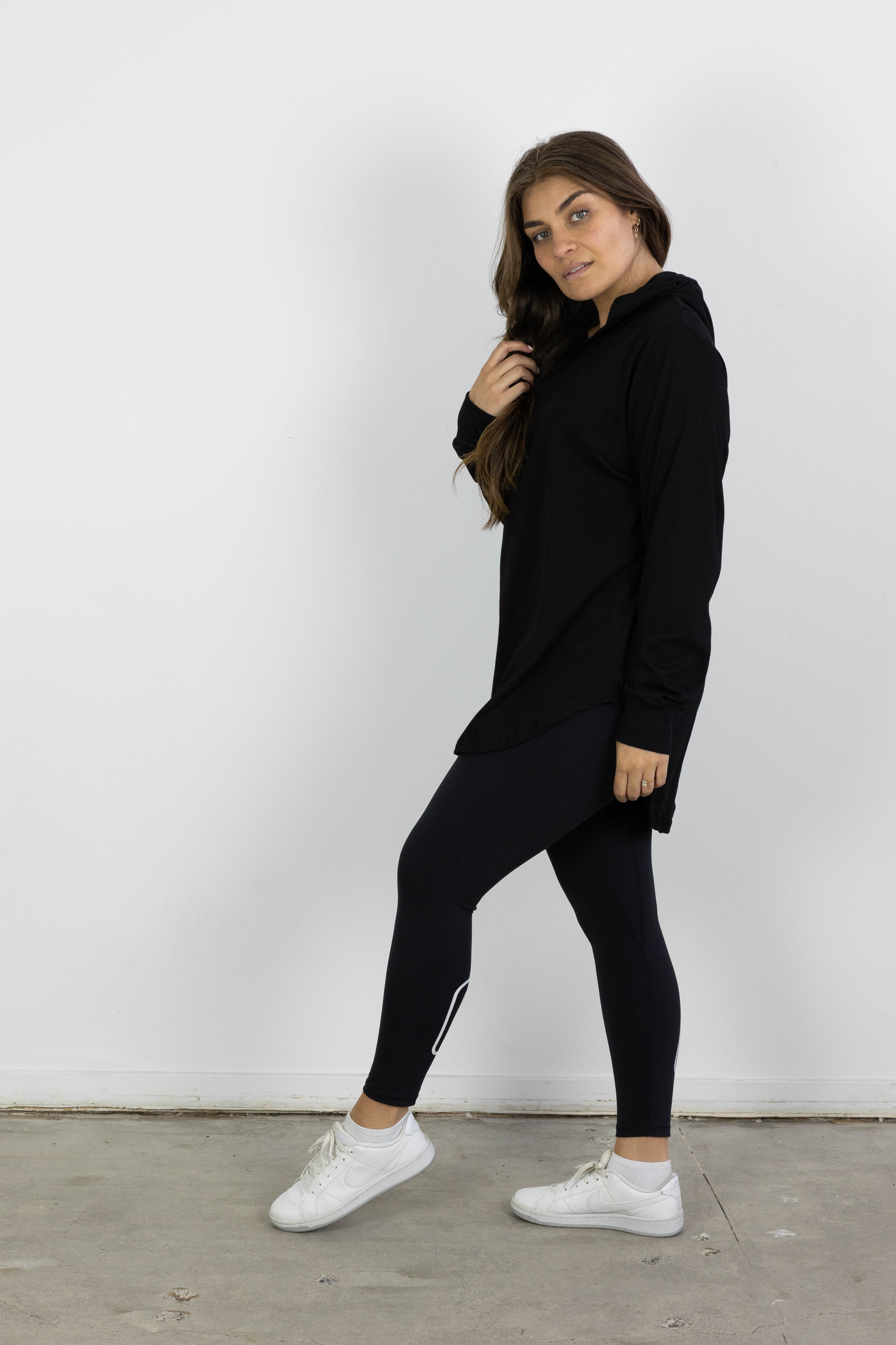 A classic lightweight long sleeve tee that is always handy to have in your wardrobe! It is the perfect lightweight fabric for when you need that extra layer, and the curved hem looks great styled underneath a jacket and paired with a pair of leggings.Details:- Black long sleeve with pink print- No pockets- Hood- Curved hemline- Light weight t-shirt material- Material: Cotton
