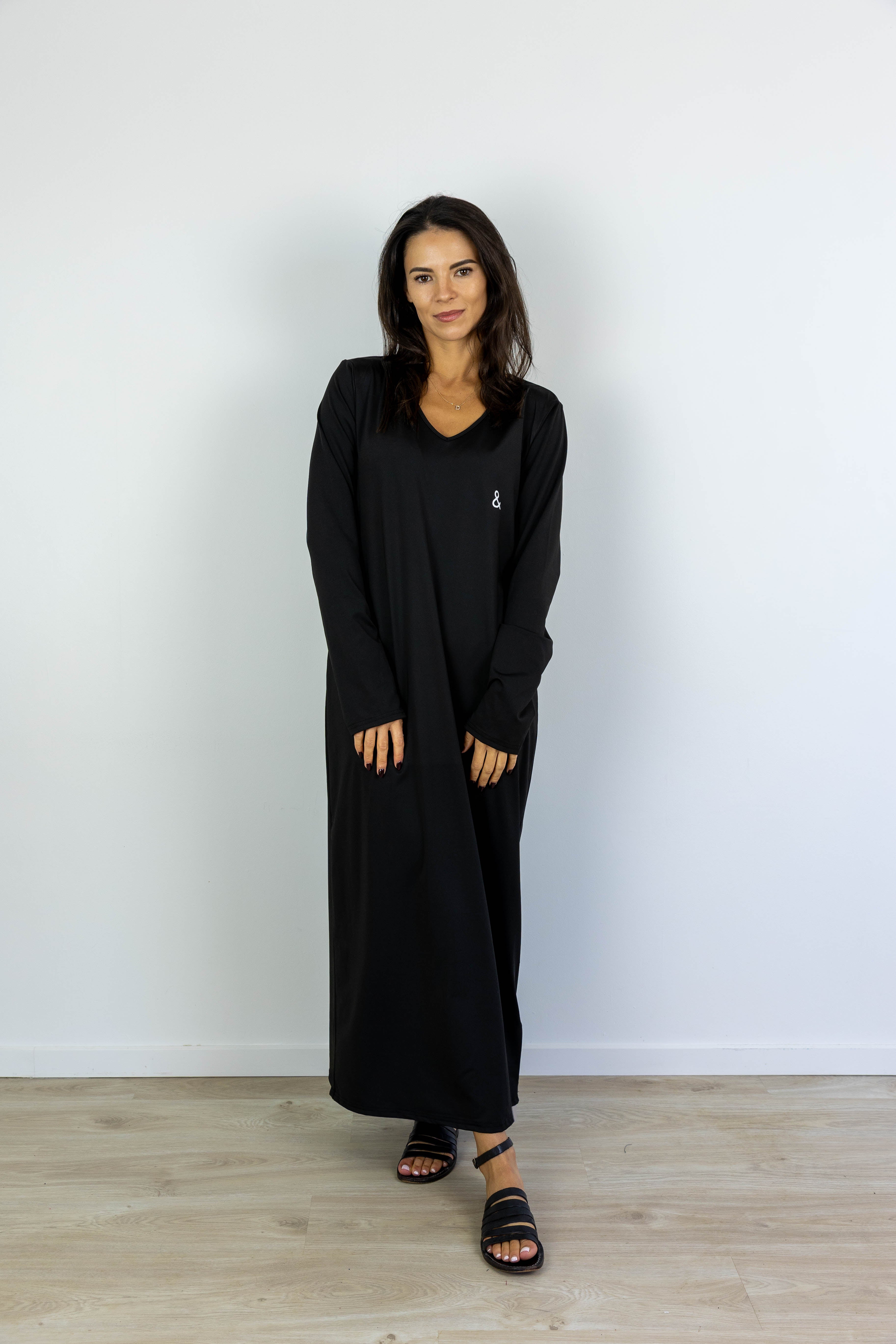 The Luna Lounge Maxi – Noir is your go-to for days when you want to feel relaxed, yet put-together. With a flattering V-neckline, full-length silhouette, and our signature minimal "&" logo detail, this piece brings softness and simplicity into one timeless design.
